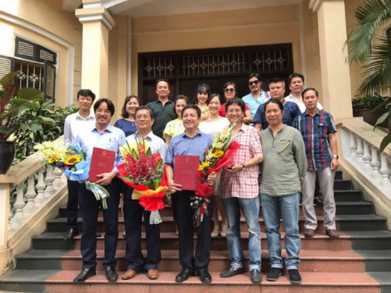 Tập thể cán bộ, nghệ sĩ Nhà hát Tuổi Trẻ tới chúc mừng nghệ sĩ Chí Trung lên chức giám đốc. Ảnh: NHTT