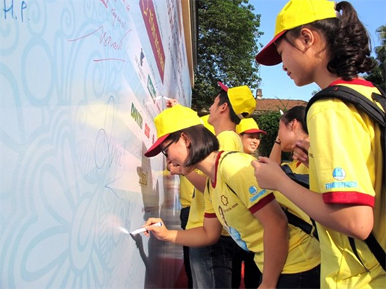 Trước đó, nhiều bạn trẻ ký tên và gửi các thông điệp lên tấm panô cổ vũ chương trình.