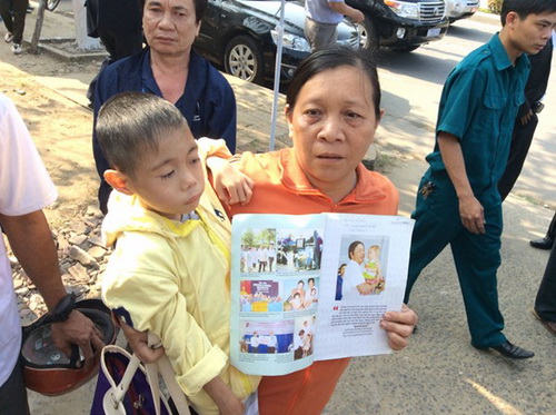 Bà Huệ bồng con vào viếng ông Nguyễn Bá Thanh. Ảnh: Tiền Phong