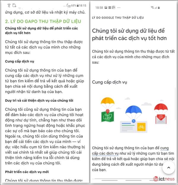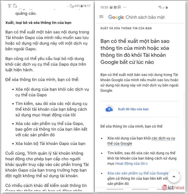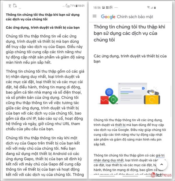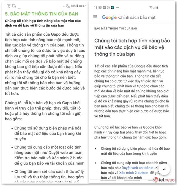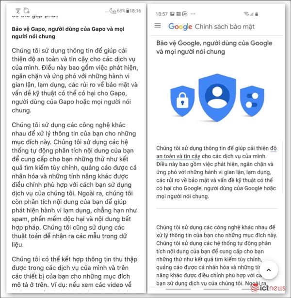 Chính sách bảo mật của hai bên chỉ khác nhau mỗi chữ Gapo và Google.