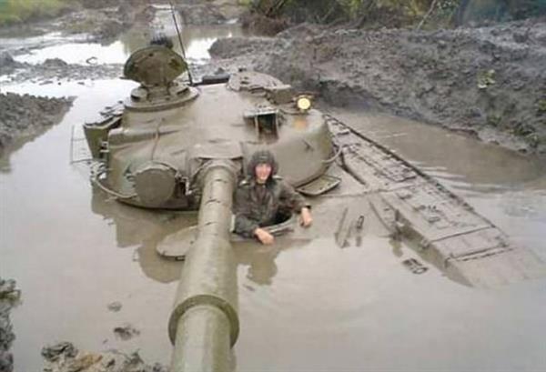 Một binh sĩ điều khiển xe tăng với biểu cảm "khó nói" khi phương tiện này lao vào bùn.