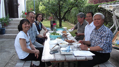 Tôi nói đùa với anh, là may có chị Mai, bà vợ người Huế chu toàn lo cho, thì anh mới làm nên nghiệp! Chỉ nội một chuyến đi xuyên quốc gia sang Áo một ngày của năm người, chị Mai đã chuẩn bị các món ăn đủ cho cả tiểu đội từ một nồi cơm điện, rau dưa, hoa quả, thịt cá đến cả phích chè nóng, phích café pha sẵn. Trên dường đi, cứ tạt vào một motel, ngả khăn trải bàn ra là có đủ một mâm tiệc ê hề.