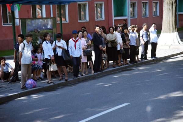 Đường phố Bình Nhưỡng chỉ náo nhiệt hơn vào giờ cao điểm: khoảng từ 8-9h sáng và 18-19h chiều hàng ngày. Trong ảnh, một điểm chờ xe điện đông đúc trong giờ tan tầm.