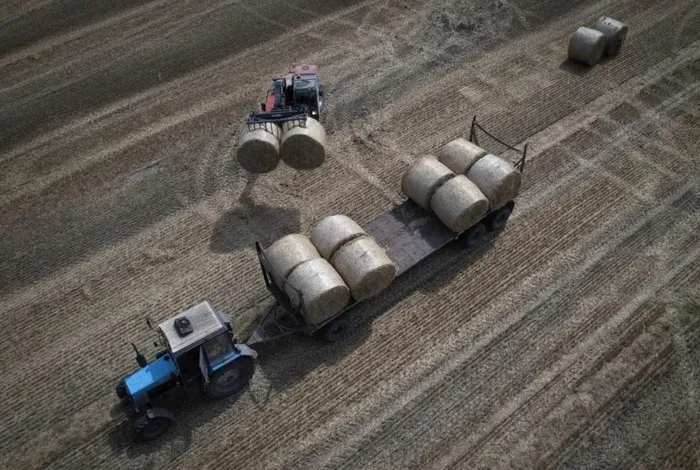 Máy gặt thu thập rơm trên cánh đồng ở vùng Kiev (Ukraine). Ảnh: AP