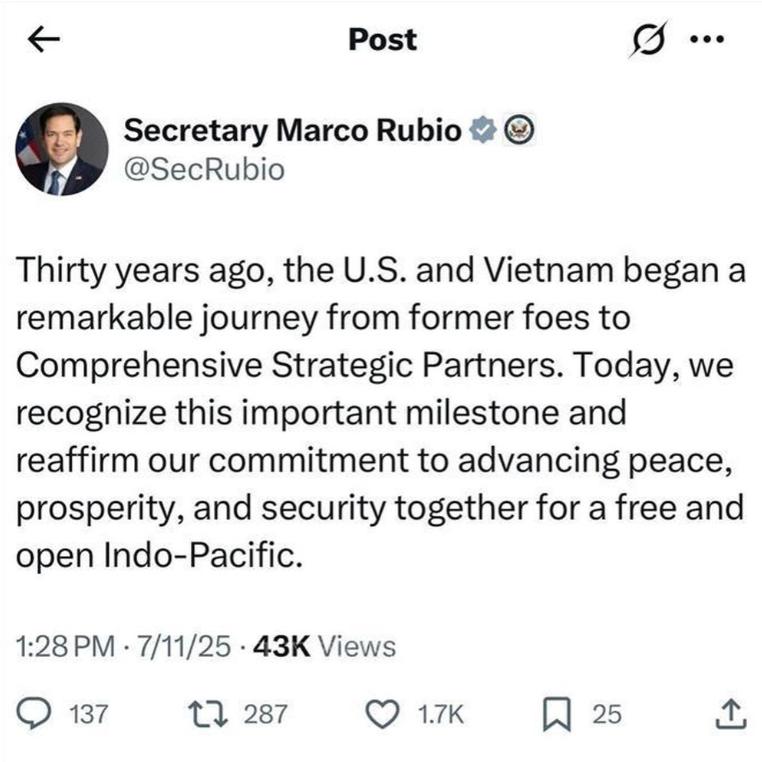 Ngoại trưởng Rubio viết: “30 năm trước, Mỹ và Việt Nam đã bắt đầu một hành trình phi thường từ những cựu thù trở thành Đối tác Chiến lược Toàn diện. Hôm nay, chúng ta ghi nhận cột mốc quan trọng này và tái khẳng định cam kết cùng nhau thúc đẩy hòa bình, thịnh vượng và an ninh vì một khu vực Ấn Độ Dương - Thái Bình Dương tự do và rộng mở".