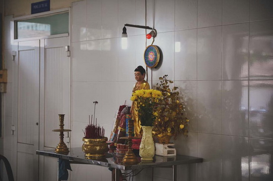 Tiếng kinh đều đặn vọng bên tai trước khi chúng tôi đặt chân vào căn phòng đầu tiên của khu nhà vĩnh biệt.