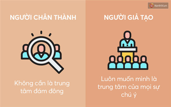 Người chân thành không quan tâm xem mình có phải là trung tâm của sự chú ý hay không. Người giả tạo thì khác, họ luôn ứng xử để nhất định phải là trung tâm của đám đông.