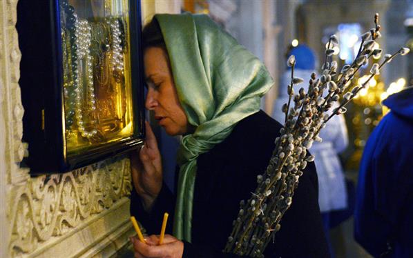 Một người phụ nữ đang cầu nguyện tại nhà thờ chính tòa ở Baku, Azerbaijan, trong ngày lễ Phục sinh.