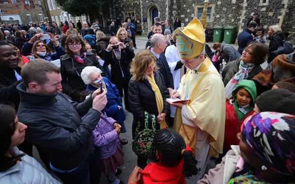Tổng giám mục Canterbury (Giám mục trưởng của Giáo hội Anh) Justin Welby gặp gỡ mọi người trong ngày lễ Phục sinh tại nhà thờ chính tòa ở Canterbury, Anh.
