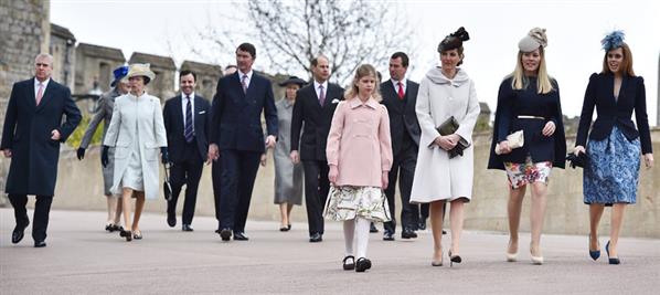 Các thành viên của gia đình hoàng gia Anh đang đến nhà thờ để tham dự lễ Phục sinh 2015 ở St George’s Chapel, lâu đài Windsor, Anh.