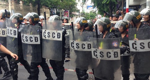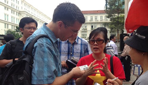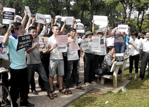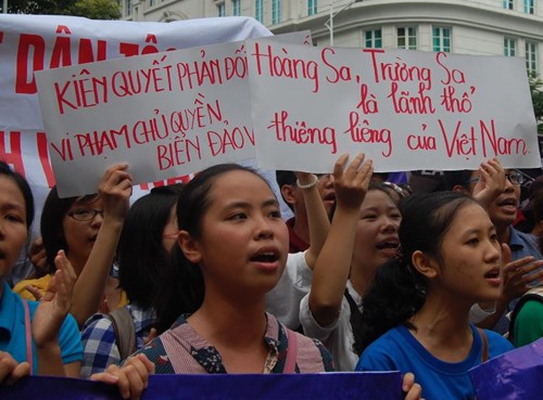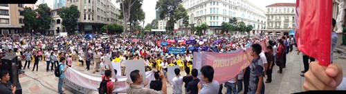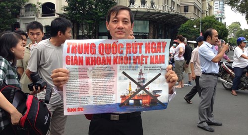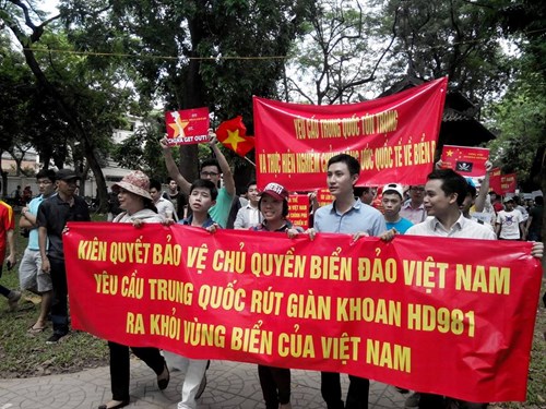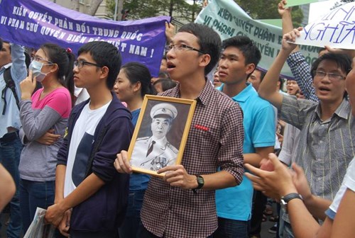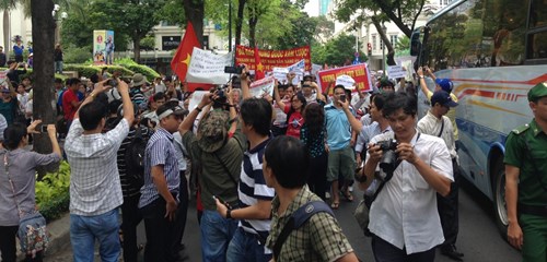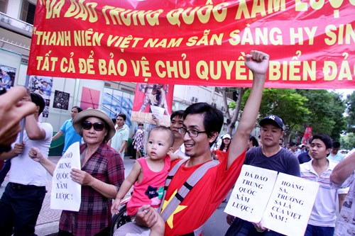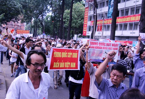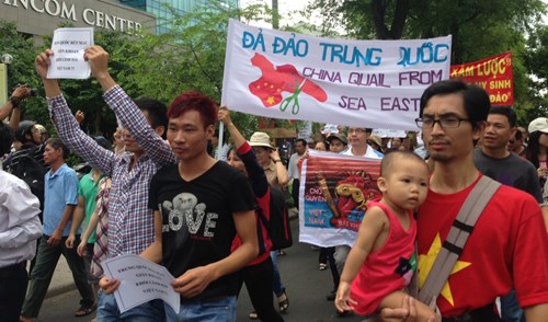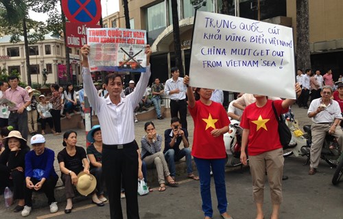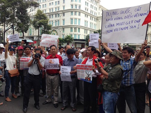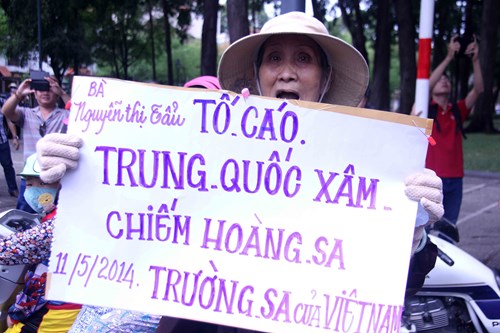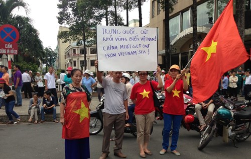Trước đó, 9g sáng 10-5, trước cửa Lãnh sự quán Trung Quốc tại TP.HCM, nhiều tầng lớp nhân dân TP đã tụ họp lại, biểu thị những bức xúc của mình trước tình hình căng thẳng tại biển Đông. Những lá cờ Tổ quốc được phất lên, những biểu ngữ “Hoàng Sa - Trường Sa là của Việt Nam”, “Trung Quốc vi phạm luật pháp quốc tế”, “Yêu cầu rút giàn khoan HD981 khỏi biển Đông” bằng ngôn ngữ Việt - Trung - Anh được giương cao, những bài hát truyền thống, khẩu hiệu nối tiếp nhau vang suốt dọc đường.