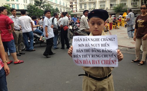 Đặc biệt bé Trần Minh Hòa Hiệp (học sinh trường Tiểu học Bắc Hải, quận 10) giăng cao biểu ngữ: “Toàn dân nghe chăng/ Sơn hà nguy biến/Hận thù đằng đằng/Biên thùy rung chuyển/Nên hòa hay chiến”….