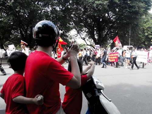 Ba cha con đi trên đường cùng hòa với dòng người hô vang hai tiếng Việt Nam.