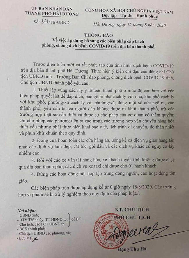 Trong tối cùng ngày, UBND TP Hải Dương đã có thông báo chính thức về việc áp dụng bổ sung các biện pháp cấp bách phòng, chống dịch Covid-19 trên địa bàn.