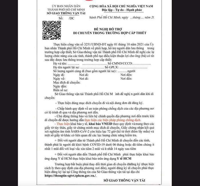 Lưu ý, người đã được sự chấp thuận bằng văn bản của UBND tỉnh, TP nơi đi cho phép đến TP.HCM không thuộc đối tượng cần Sở TP.HCM xác nhận di chuyển.
