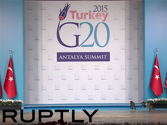 Mặc dù an ninh được thắt chặt ở Hội nghị thượng đỉnh G20 nhưng một đàn m​èo vẫn có thể tự do đi lại trên sân khấu đang truyền hình trực tiếp.