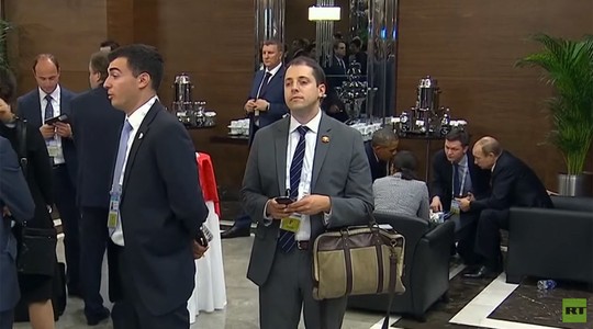 Một đoạn video cho thấy một người đàn ông nhích từ từ đến gần chỗ 2 nhà lãnh đạo đang nói chuyện trong khi giả bộ nhìn sang hướng khác. Có thể thấy rõ đôi tai ông ta cố ý hướng về phía hai nhà lãnh đạo Mỹ và Nga.