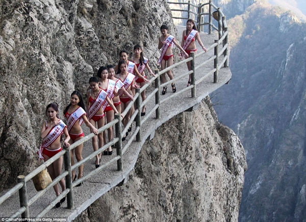 Các cô gái đã phải gạt đi nỗi sợ hãi về độ cao khi họ buộc phải trình diễn thời trang dọc theo một lối đi nhỏ hẹp trên sườn núi có độ cao 2.000m so với mặt đất trong bộ bikini màu đỏ và giày cao gót đen trong “thử thách điềm tĩnh”, phần thi quan trọng của một cuộc thi sắc đẹp ở Trung Quốc.
