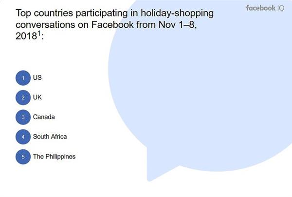 Lễ hội mua sắm Black Friday đang trở thành hiện tượng toàn cầu. Facebook IQ cho biết 5 quốc gia hàng đầu tham gia vào các cuộc hội thoại mua sắm trên mạng xã hội trải rộng trên 4 châu lục: Bắc Mỹ (Mỹ, Canada), Châu Âu (Anh), Châu Phi (Nam Phi) và Châu Á (Philippines).