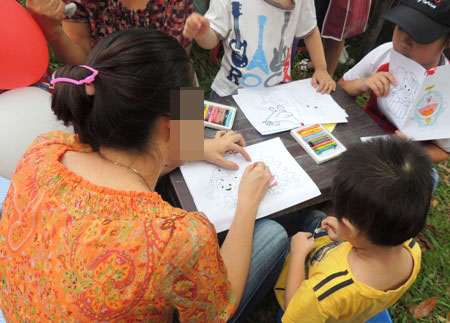 Trong khi nhiều cháu bé nhỏ hơn đang thỏa sức ngồi vẽ tranh cát theo ý tưởng của mình thì không ít phụ huynh ngồi kèm, bắt con ngồi im để... bố mẹ vẽ. Họ sợ con làm đổ cát, sợ con vẽ sai… nên tự tay vẽ luôn. Có người còn cầm bức tranh do mình vẽ với vẻ đầy tự hào như thể là ý tưởng của con. Có tình nguyện viên tinh ý, đã đến nhắc đây là trò chơi của trẻ, hãy để trẻ tự chơi mà chẳng thể cản được sự “nhiệt tình” của bố mẹ.