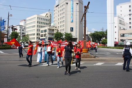 Đọc qua các tuyến đường trung tâm thành phố, đoàn diễu hành giơ cao quốc kỳ, vừa đi vừa hô vang các khẩu hiệu bằng tiếng Việt, tiếng Anh và tiếng Nhật. Những khẩu hiệu “Việt Nam yêu chuộng hòa bình”, “Trung Quốc chấm dứt ngay hành động xâm chiếm chủ quyền Việt Nam” và “Trung Quốc phải tôn trọng luật pháp quốc tế” được đồng thanh cất lên rất hào sảng thể hiện lòng yêu nước son sắc.