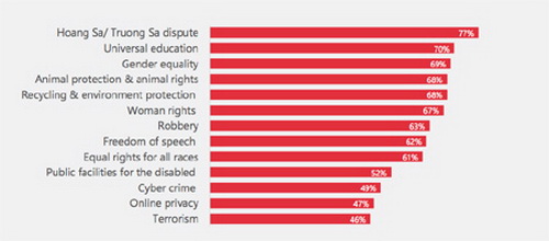 Có một thông tin thú vị: Trái ngược với những gì người ta vẫn nghĩ về thế hệ Z, nhóm này rất quan tâm tới các vấn đề xã hội, ví dụ như tình hình biển Đông là một trong những đề tài được thảo luận nhiều nhất, tiếp sau đó là giáo dục toàn cầu và bình đẳng giới.