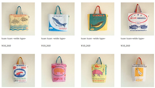 Cô Yuki chủ của nhãn hiệu túi xách làm từ bao bì thức ăn gia súc Tuantuan cũng bắt đầu phát triển dòng sản phẩm này từ hơn 1 năm nay. Cô không chỉ thực hiện những sản phẩm túi xách mà còn mở rộng ra nhiều sản phẩm khác như túi đựng ipad, ví, vỏ đựng điện thoại… Tất cả đều được làm từ bao bì tái chế nhập khẩu từ Việt Nam.