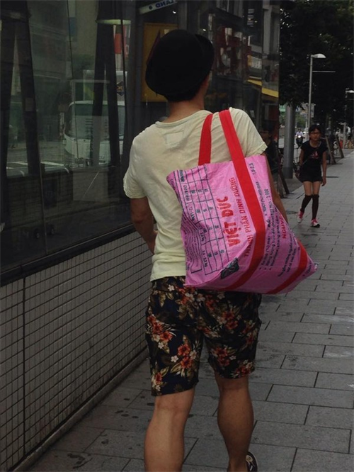 Chiếc túi làm từ bao bì thức ăn gia súc được nhiều người dân Nhật sử dụng khi ra đường. Ảnh: Phan Đức Thái/Infonet.