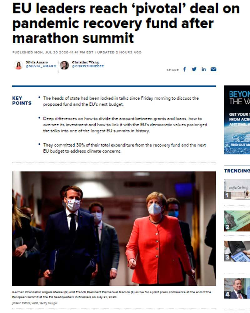 Sự phản đối quyết liệt của nhiều nước đã buộc Thủ tướng Đức Angela Merkel và Tổng thống Pháp Emmanuel Macron cùng Chủ tịch Hội đồng châu Âu Charles Michel buộc phải đưa ra những đề xuất mới nhằm phá vỡ thế bế tắc.