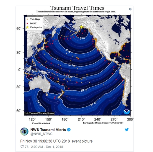 Cơ quan chức năng ban hành cảnh báo sóng thần cho một số khu vực ở miền Nam Alaska, sau đó đã hủy cảnh báo này. Ảnh: Twitter.