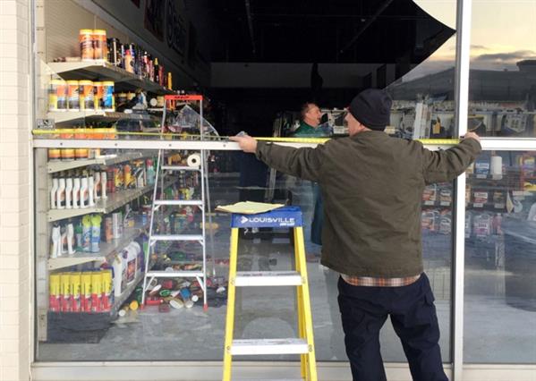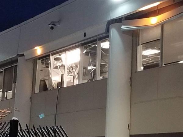 Cửa kính và tường bên ngoài của một tòa nhà bị hư hỏng sau trận động đất. Ảnh: Twitter