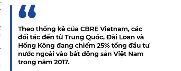 Theo thống kê của CBRE Vietnam, các đối tác đến từ Trung Quốc, Đài Loan và Hồng Kông đang chiếm 25% tổng đầu tư nước ngoài vào bất động sản Việt Nam trong năm 2017, tăng 21% so với năm 2016. Riêng trong quý I/2018, nhu cầu mua bất động sản Việt Nam của các nhà đầu tư Trung Quốc tăng hơn 300% so với cùng kỳ năm 2017. Ngoài Thái Lan, chỉ có Malaysia đứng trên Việt Nam về độ hấp dẫn của các nhà đầu tư bất động sản Trung Quốc.