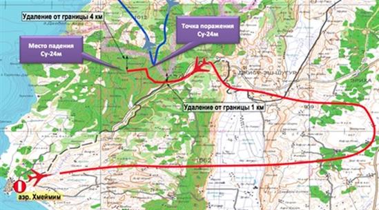 Bản đồ do Thổ Nhĩ Kỳ công bố cho rằng máy bay Nga (đường gấp khúc màu đỏ) xâm phạm không phận Thổ Nhĩ Kỳ nên bị F-16 của nước này (đường gấp khúc xám) bắn rơi
