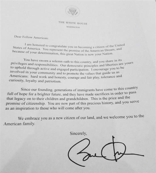 “Chúng tôi chào mừng ông là công dân mới của đất nước chúng ta, chào mừng ông đến với gia đình Mỹ” – bức thư viết, cùng chữ ký của ông Obama.
