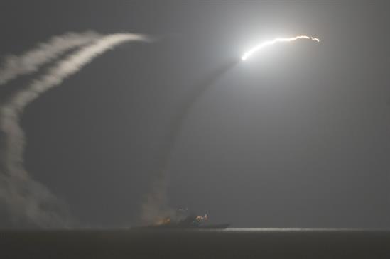 Tên lửa Tomahawk được tuần dương hạm USS Philippine Sea (CG 58) phóng đi trên vịnh Ả rập, rạng sáng 23.9.2014 nhắm vào các vị trí của phiến quân IS tại Syria. Tên lửa hành trình Tomahawk là vũ khí được Mỹ sử dụng nhiều nhất trong các đòn tấn công từ trên biển - Ảnh: Hải quân Mỹ