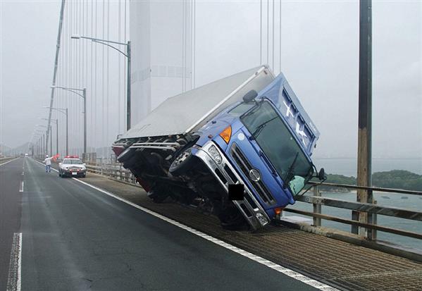 Gió lớn “quật” nghiêng cả xe tải tại Sakade. Ảnh: AFP