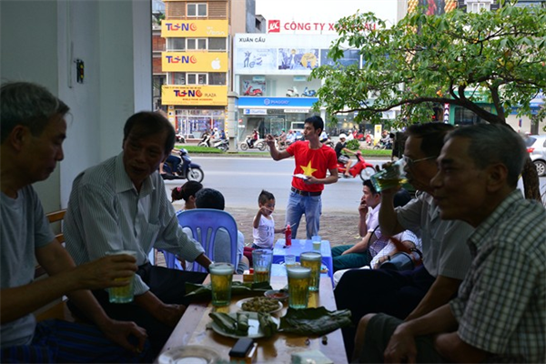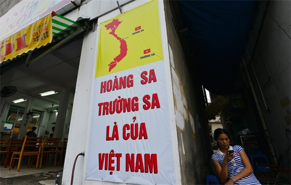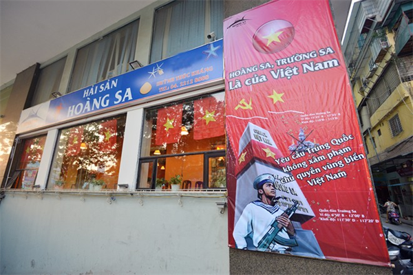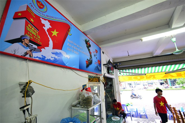 "Trường Sa, Hoàng Sa là của Việt Nam/ Chung tay vì biển đảo quê hương" là những khẩu hiệu được treo phía trong nhà quán bia trên đường Xã Đàn.