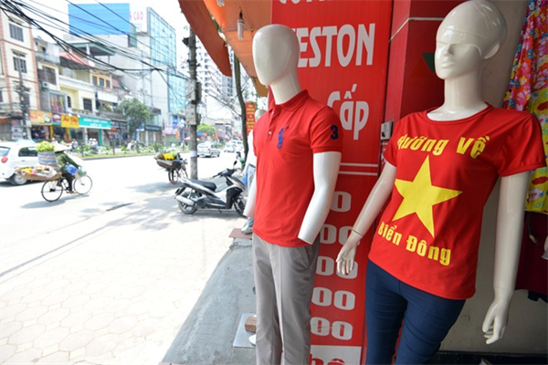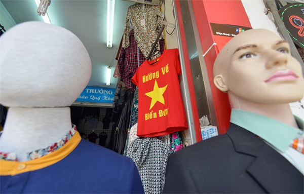 Gần ngã tư Cầu Giấy cũng xuất hiện cửa hàng bán áo với dòng chữ "Hướng về biển Đông".