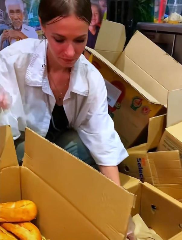 Từ sáng đến chiều tối, Jain Pavlova (quốc tịch Nga) cùng nhóm bạn tự tay làm bánh mì, đóng thùng gửi xe đến Đắk Lắk, Gia Lai... để hỗ trợ bữa ăn cho bà con bà con vùng lũ miền Trung.