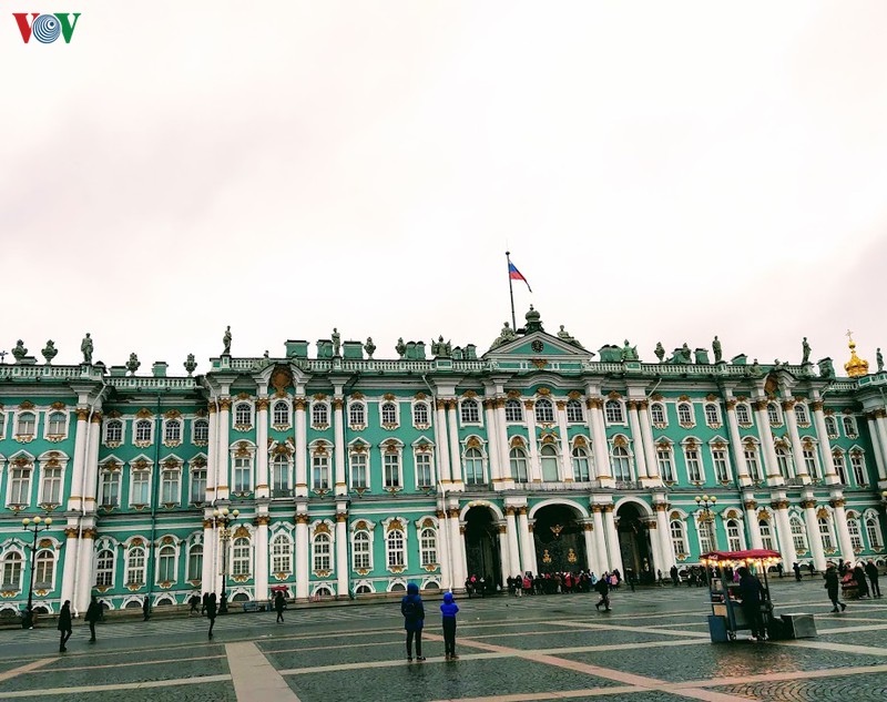 Cung điện Mùa Đông được xây dựng trong những năm 1754 – 1762 bên bờ sông Neva, do kiến trúc sư người Italia B.F.Rastrelli thiết kế theo yêu cầu của Nữ hoàng Elizaveta I theo phong cách nghệ thuật Baroque với 2 màu chủ đạo là xanh và trắng. Trong một thời gian dài, Cung điện Mùa Đông là nơi ở của các Nga hoàng.