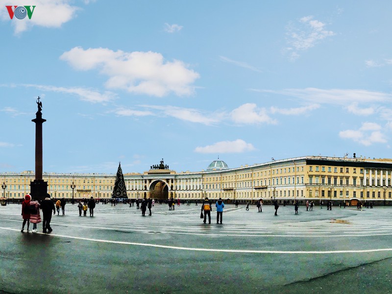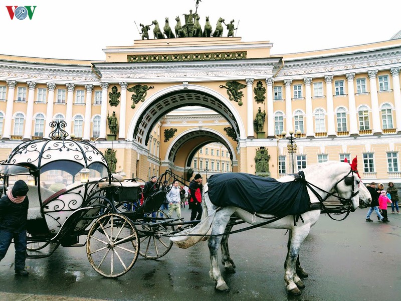 Ở quảng trường Cung điện Mùa đông trước Tòa nhà tổng tham mưu, du khách có thể chụp ảnh lưu niệm với xe ngựa.