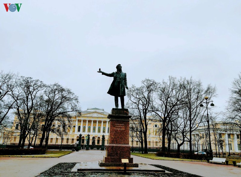 Tượng Đại thi hào Puskin trong khuôn viên quảng trường nghệ thuật, phía sau là Bảo tàng quốc gia Nga. Bảo tàng này được xây dựng vào năm 1895 dưới thời vua Nicholas II với tòa nhà chính là Cung điện Mikhailovsky. Hiện bảo tàng chủ yếu trưng bày các tác phẩm mỹ thuật.