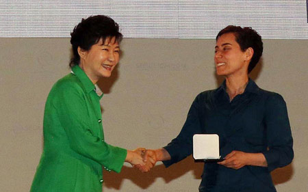 Tổng thống Hàn Quốc Park Geun-Hye (trái) bắt tay chủ nhân giải Fields tại lễ trao giải hôm 13/8. Ảnh: Reuters