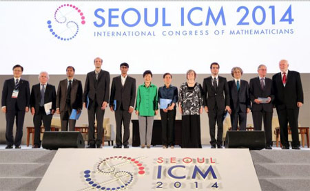 Bà Maryam Mirzakhani (thứ 6 từ phải sang) tại lễ trao giải hôm 13/8 diễn ra tại Hàn Quốc