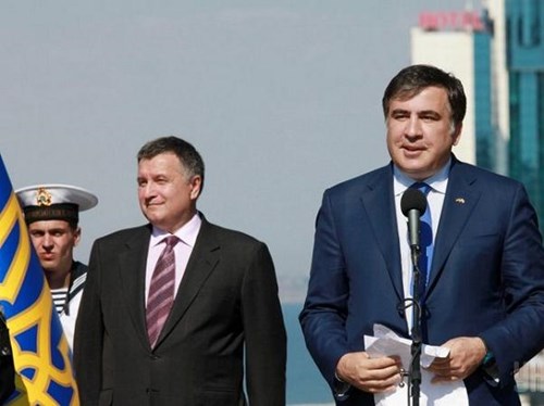Thống đốc Odessa Mikhail Saakashvili (phát biểu) và Bộ trưởng Nội vụ Ukraine Arsen Avakov