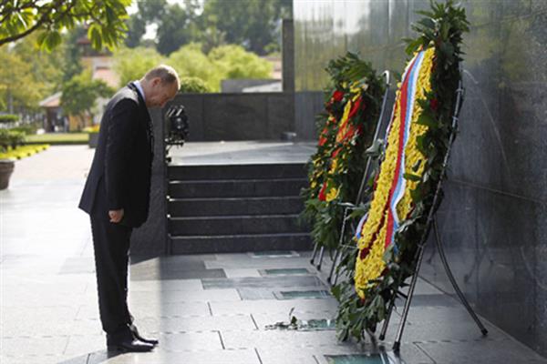 Tổng thống Putin cúi chào trang trọng trước lăng Chủ tịch Hồ Chí Minh khi đến thăm người. Ảnh: TTXVN.