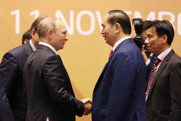 Chủ tịch nước Trần Đại Quang gặp gỡ Tổng thống Nga Putin trong khuôn khổ Tuần lễ Cấp cao APEC 2017 tại thành phố Đà Nẵng chiều 10/11. Ảnh: Baochinhphu.vn