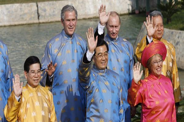 Trong ảnh, Tổng thống Nga cùng các lãnh đạo APEC mặc trang phục truyền thống của Việt Nam để chụp ảnh kỷ niệm. Ảnh: Vietbao.