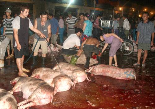 Cho đến khi mổ xong, thịt lợn vẫn để ngay trên nền đất