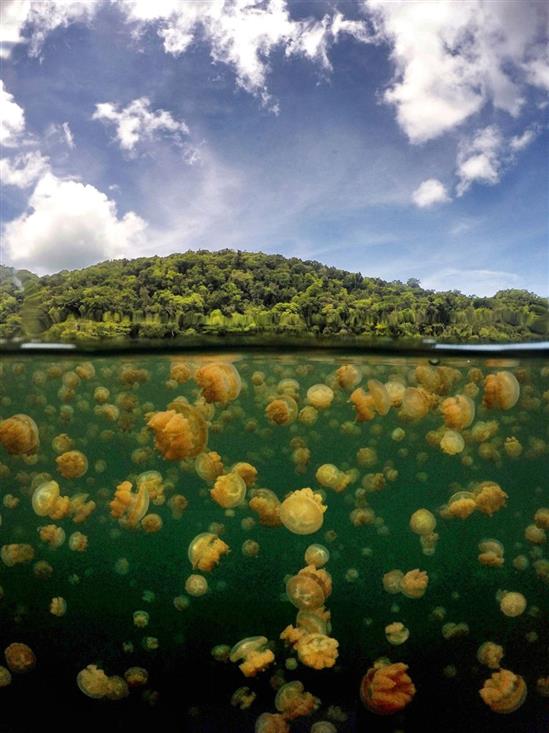 Hồ sứa (Jellyfish lake) là một hồ nước mặn khá lớn ở quốc đảo Palau thông với Thái Bình Dương qua các hang động ngầm trong núi đá. Cư dân chủ yếu tại đây chính là loài sứa vàng và sứa mặt trăng, xâm nhập vào hồ cách đây hàng nghìn năm và bị mắc kẹt ở lại. Trải qua nhiều năm, số lượng loài sứa này đã đạt đến hàng triệu con. Hồ là điểm thu hút đông đảo du khách yêu thích bộ môn lặn biển. Ảnh: Benjamin Lowy/Contrtibutor/Getty Images.